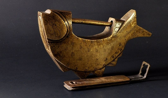 说到底,木质锁具还不足以抵挡剧烈撞击或者火烧。东汉时期,开始使用青铜来制作锁体。入唐之时,古代工匠凭借过人的智慧,使用金、银、铜、铁等全金属材质制锁。直至明朝,遂发展为广锁、花旗锁、首饰锁、刑具锁四大类。古锁工艺精致奥妙,文化内涵丰富,人们时常在锁体上雕花刻字,寓意深远,尤以鱼形锁为例,《芝田录》中记载:“门锁必为鱼者,取其不暝守夜之意。”