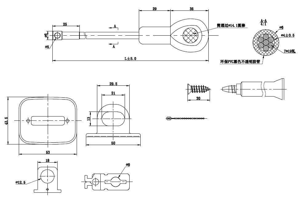 材质:锌合金搭扣,缆绳为PVC+钢丝
