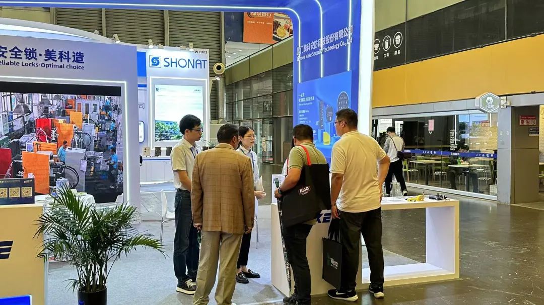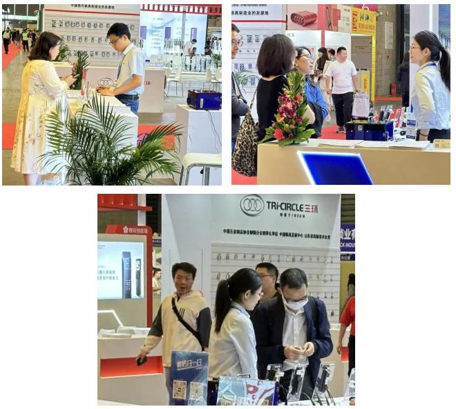 展位前人来人往。不少观展者驻足了解并体验产品,畅谈锁具和五金结构件新趋势,分享市场新动态。