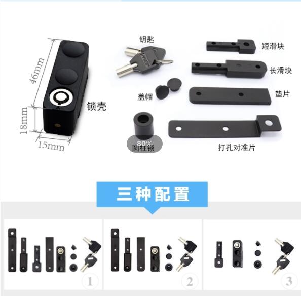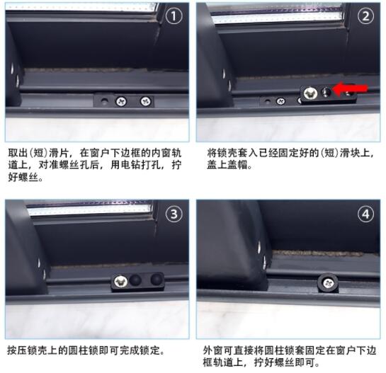 这种安装方式在窗扇底部安装一个类似插销原理的锁具,在窗户下边框的内窗轨上打几个孔实现窗户打开位置的限位。通过窗户锁的使用,实现防盗和防儿童开启的功能。