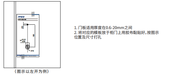2. 将对应的模板放于柜门上用胶布黏贴好,按图示位置及尺寸打孔