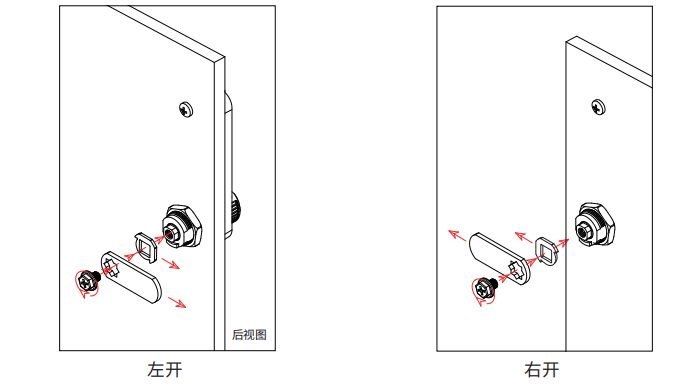 2、在确定锁具安装方向后,需要判断锁具尺寸与柜子是否合适,门板的厚度,锁具需要左开门还是右开门,以确定锁舌安装方向。