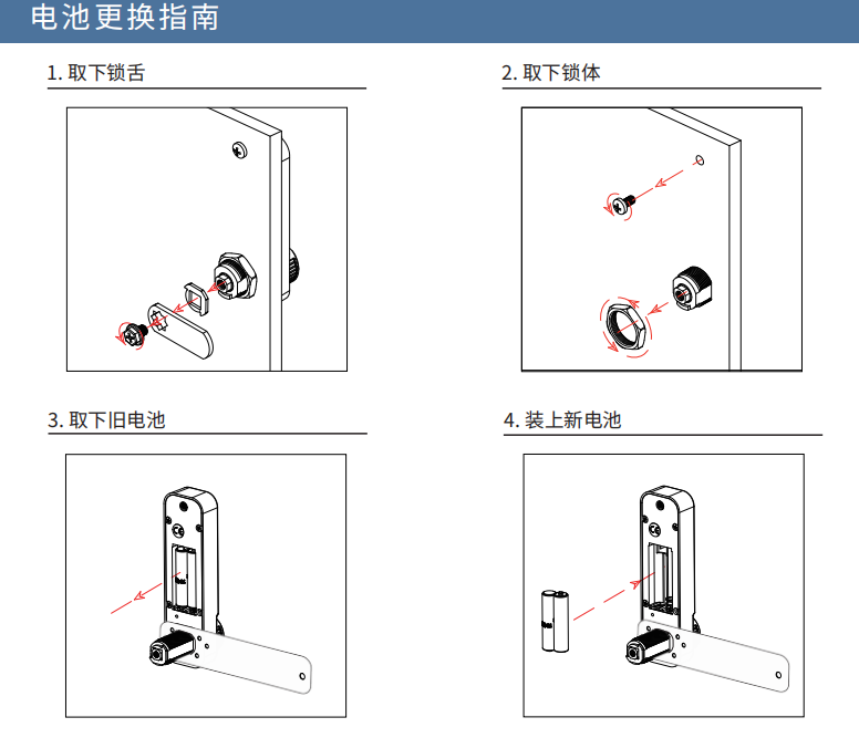 经过以上步骤,密码转舌锁的安装就完成啦。不过,对电子密码锁来说,更换电池是常有之事。由于目前多数电子密码锁采用的是一体式设计,电池更换时也需要亿万28