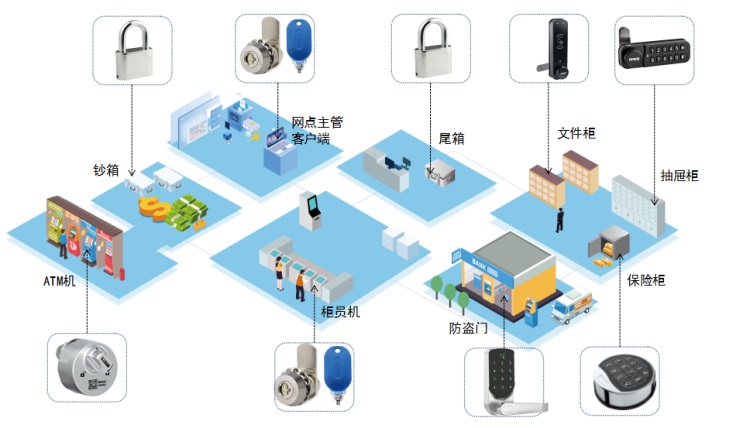 随着银行网点智能化改造趋势日益明晰,各网点人工柜台逐步由各种自助类设备取代。在日常的运营及维护管理工作中,由于各场景电子化设备机柜门上的机械锁及钥匙品牌各异,种类繁多,不仅增加网点钥匙管理难度,员工操作繁琐,风险倍增。