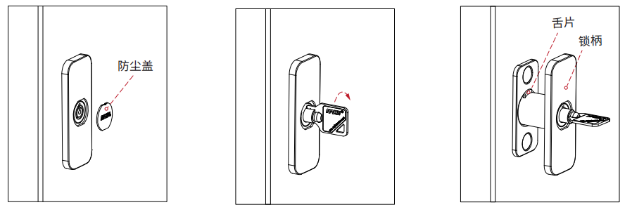 在遇到电池没电或电路故障等问题时,可以借助应急钥匙实现开锁。用户需取下防尘盖,插入钥匙顺时针旋转90°,锁柄和舌片会自动弹出,完成紧急开锁。