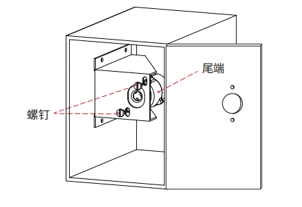 亿万28智能售货机锁分为前端和尾端。在安装时,首先将锁具尾端及螺钉对准相应的安装孔后,顺时针旋紧螺钉,将尾端固定在内部安装板上。