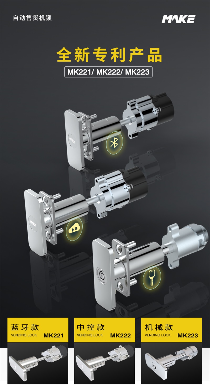 MK221通过蓝牙信号传输实现锁具和手机之间的互联,在手机APP上点击开锁按钮解锁。MK222通过开关锁控制线实现系统与锁具的连接,在管理设备上按压开锁按钮解锁。MK223将钥匙顺时针旋转90°即可开锁,解决传统T型锁旋转多圈开锁的痛点。
