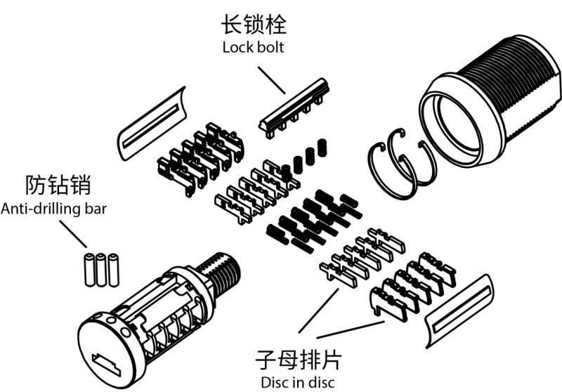 子母排片结构锁芯结构很大程度上决定锁具安全性。M1创新“排片套排片”理念,设计子母排片结构,牢固度高,防撬、防钻、防技术性开启。比一般的排片钥匙系统结构,安全等级更高。